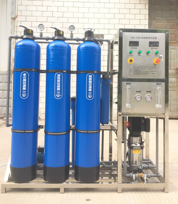 自來(lái)水/井水--原水箱--多介質(zhì)過(guò)濾器--活性炭過(guò)濾器--軟化過(guò)濾器/加藥裝置--保安過(guò)濾器--高壓泵--反滲透部分--純水箱--用水點(diǎn)